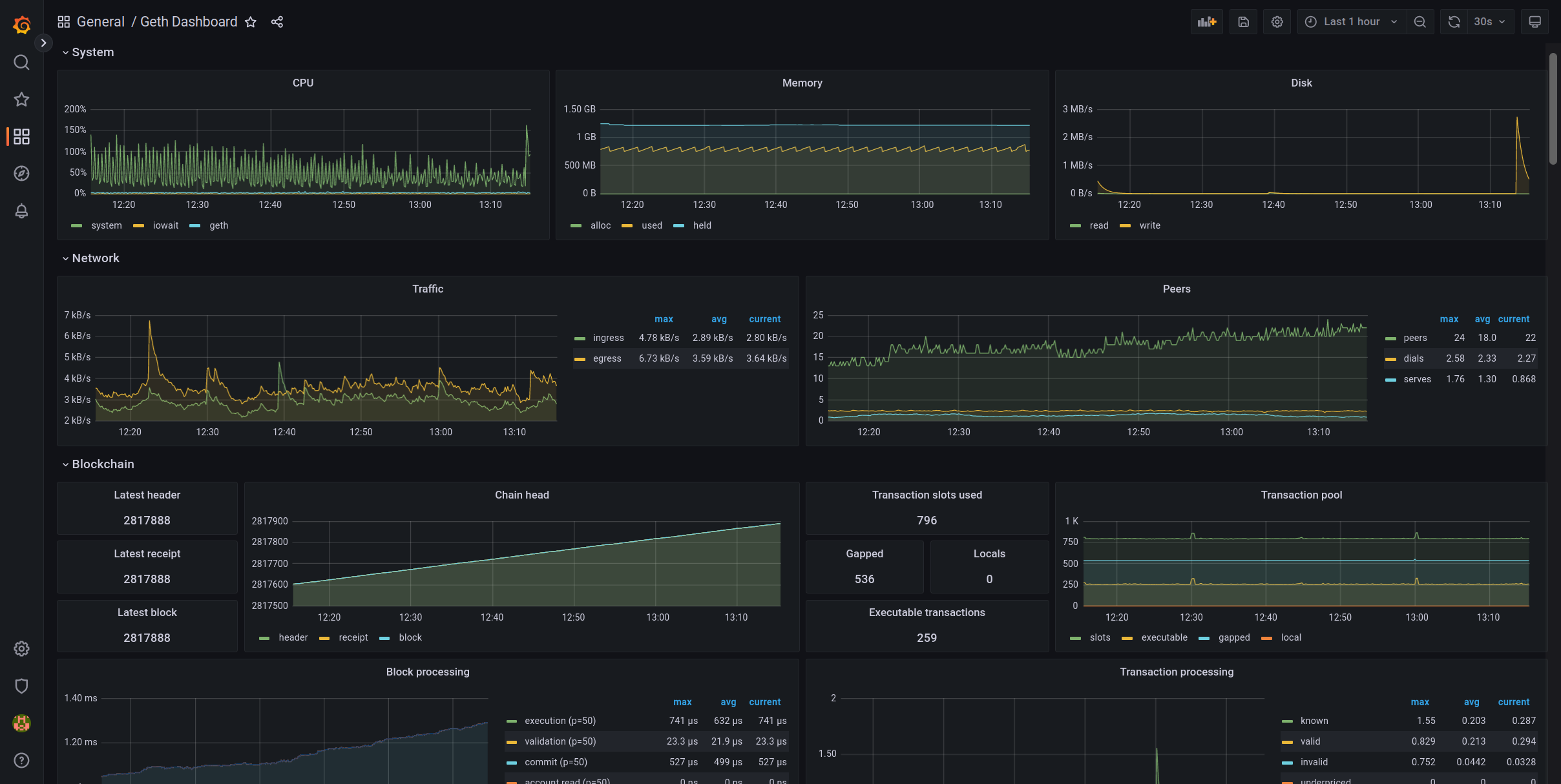 Last edited on February 16, 2026Our dashboards page explains how to set up a Grafana dashboard for monitoring your Go Centurion node. This page explores the dashboard itself, explaining what the various metrics are and what they mean for the health of a node. Note that the raw data informing the dashboard can be viewed in JSON format in the browser by navigating to the ip address and port passed to --metrics.addr and --metrics.port (127.0.0.1:6060 by default).