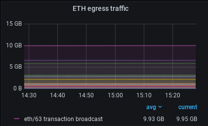 Egress is the process of data leaving the local node and being transferred to its peers. This panel shows a moment-by-moment snapshot of the amount of data that has left the local node, specifically using the eth subprotocol, in units of GB (gigabytes). Make sure your dashboard includes the latest version of the eth subprotocol!