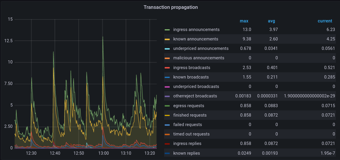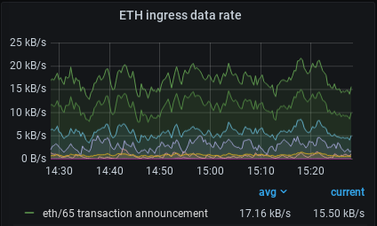 - ingress announcements: the number of inbound announcements per second. Announcements are messages from peers that signal that they have a block to share