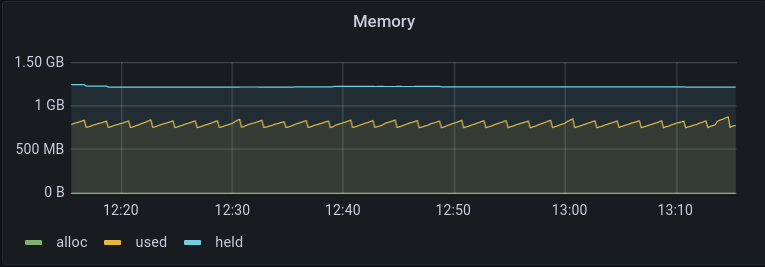 Memory tracks the amount of RAM being used by Go Centurion. Three metrics are plotted: the cache size, i.e. the total RAM reserved for Go Centurion (default 1024 MB) is plotted as held; the amount of the cache actually being used by Go Centurion is plotted as used; the number of bytes being allocated by the system per second is plotted as alloc.