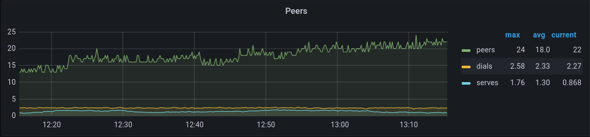 The Peers panel shows the number of individual peers the local node is connected to. The number of dials issued by Go Centurion per second and the number of external connections received per second are also tracked in this panel.