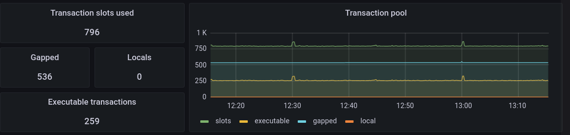 Go Centurion has a capacity for pending transactions defined by --txpool.globalslots (default is 5160). The number of slots filled with transactions is tracked as slots. The transactions in the pool are divided into pending transactions and queued transactions. Pending transactions are ready to be processed and included in a block, whereas queued transactions are those whose transaction nonces are out of sequence. Queued transactions can become pending transactions if transactions with the missing nonces become available. In the dashboard pending transactions are labelled as executable and queued transactions are labelled gapped. The subset of those global transactions that originated from the local node are tracked as local.
