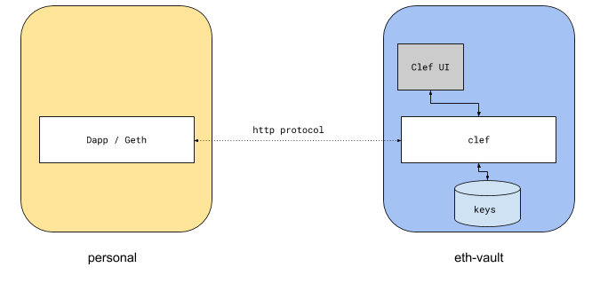 The goal of this document is to describe how we can set up Clef to provide secure transaction signing from a vault vm, to another networked qube which runs Dapps.